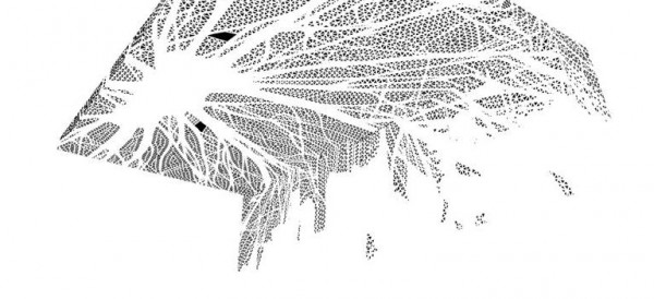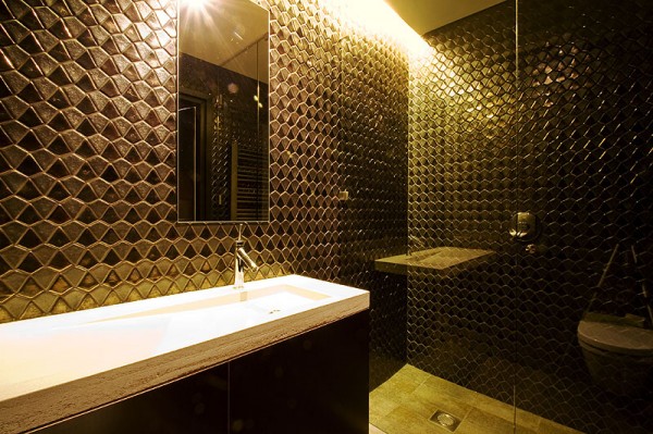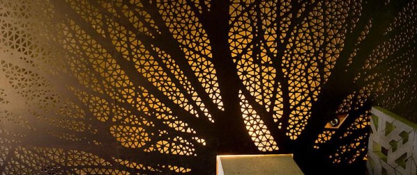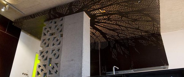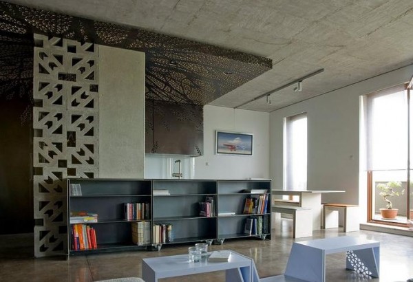 The kitchen, the focal point of the apartment draws the eye to the perforated plywood ceiling that converges into upper vertical cabinets of the same material. Computer generated and CNC milled this elaborate organic latticework is inspired by radiating tree branches which are backlit as ambient lighting. Bookshelves located below the kitchen’s island counter are moveable on casters exposing bar-style sitting area at the island . The bookshelves also function as an office desk or sideboard. Multifunctional modular furniture pieces were designed as a set of three to compliment the space.