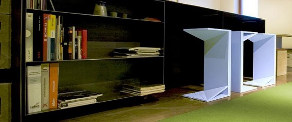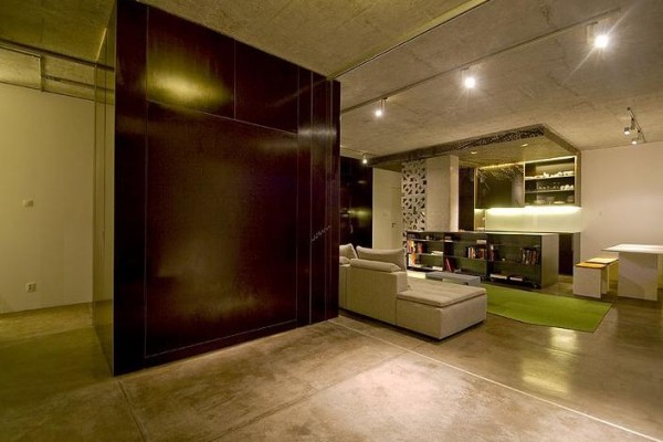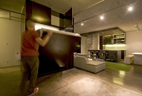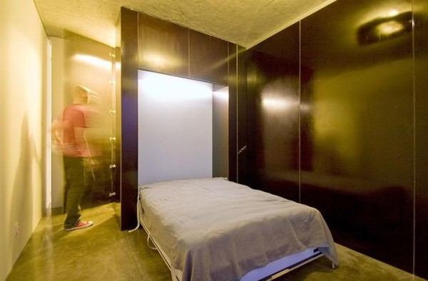 The main living area houses a cube which contains hidden sliding doors, cabinets and a fold down bed. Not unlike the Murphy bed though this one creates its own room by pulling out a panel.