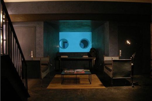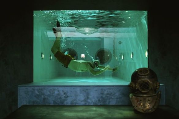 The interior of the building has been divided into seven different levels. The most decadent of these is the ground floor, which accommodates a gigantic swimming pool. This unexpected addition is visible through panes of glass in the entrance hall and guest room.