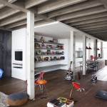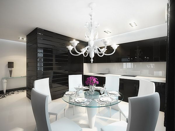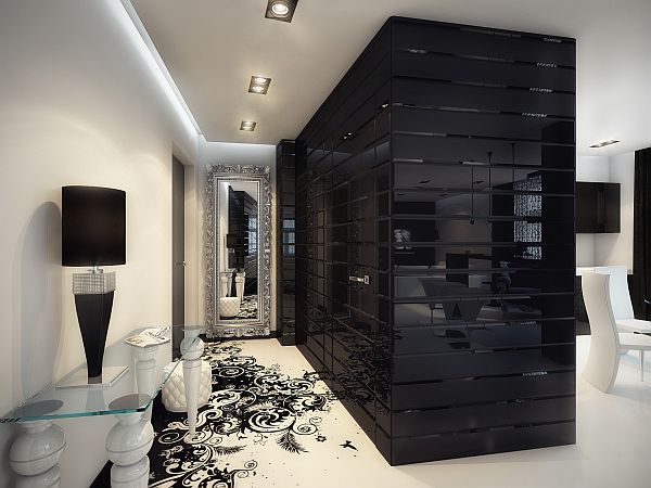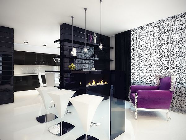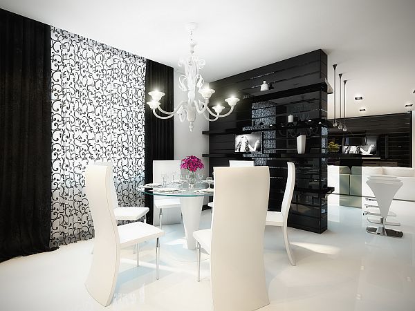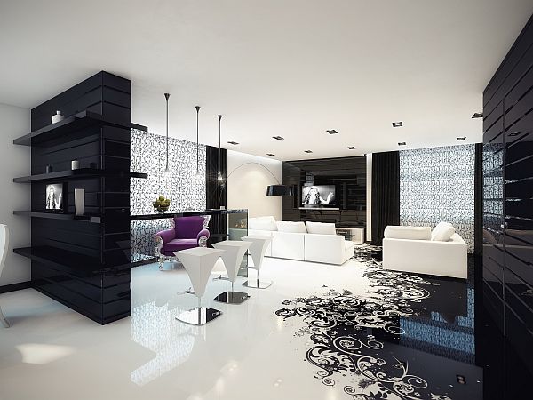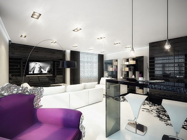 Geometrix of Russia is known here for designing crisp, black and white environments. This time they decided to spice it up with a splash of color,as well as some ornamental patterns. It can be found in every room, no matter whether it is an armchair, a vase with flowers on the glass table or a decorative object on a shelf. Among the details that give a special mood to the entire house, there are the interesting lamps of different forms, but also ceiling mounted lighting that make the living room very special.