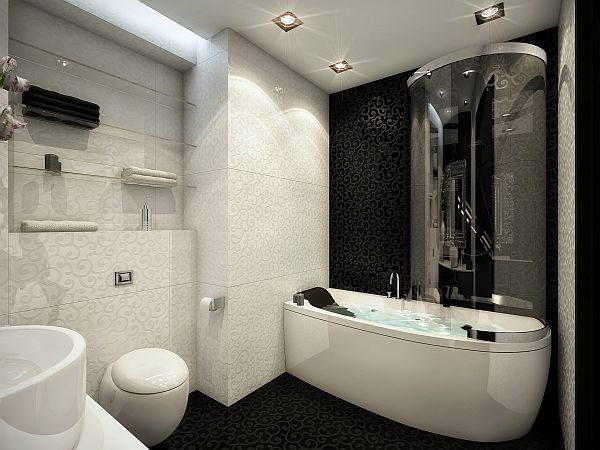 The curtains and the marble floor have floral motives; the purple armchair with its interesting silver edge takes us back in the past. The bathroom in its blackness has very modern tiles and a floral motif that reminds me the floral motives of the Arabian 1001 Nights. A black and white environment provides black and white furniture, without being too much.
