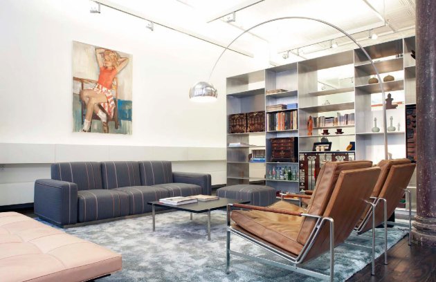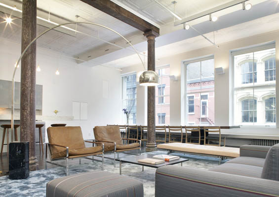 The historic front and back industrial windows define the loft and make it feel even grander. In order to emphasize these and to allow light and views into the 100’ deep building, the architects kept the space very open front to back.