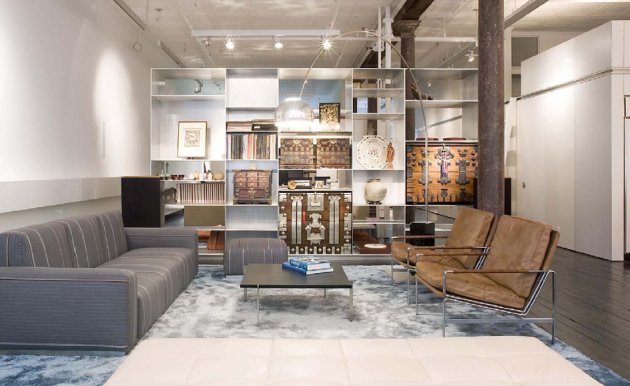 Three 8 foot tall freestanding volumes arranged down the center of the space define the different areas.