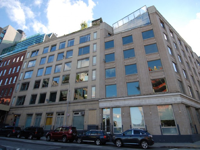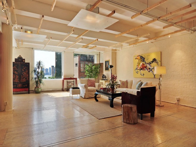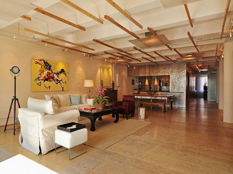 This solid cement and steel industrial loft is located divide between Soho and Tribeca. At 45+/- feet wide, the loft offers a rare, nearly square layout allowing for 3 ample sized bedrooms located in a rear bedroom wing and providing a division of space between living and sleeping quarters.