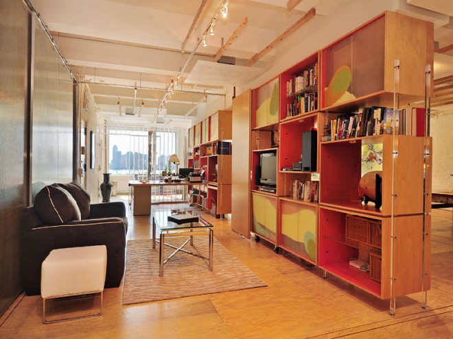 You could miss this industrial loft for a library – a huge bookshelf dominates the living room.