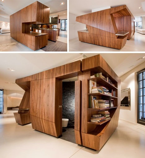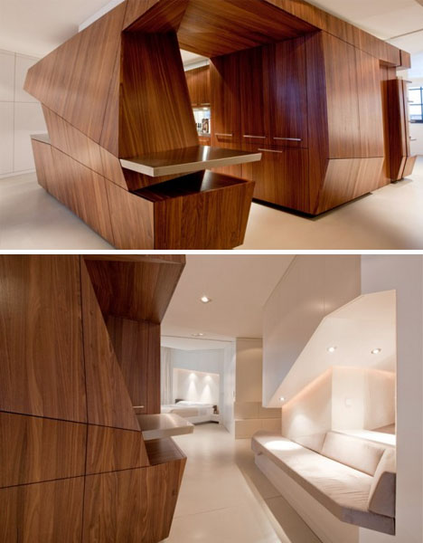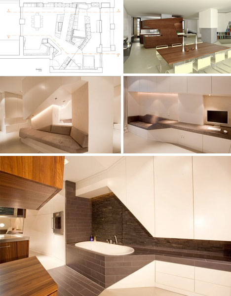 Reportedly costing $200,000, the loft makes wonderful use of space with a freestanding centralized wood veneer kitchen that contains a half bath and built-ins whose surfaces blend into the wall angles.