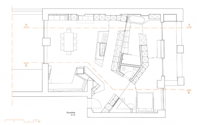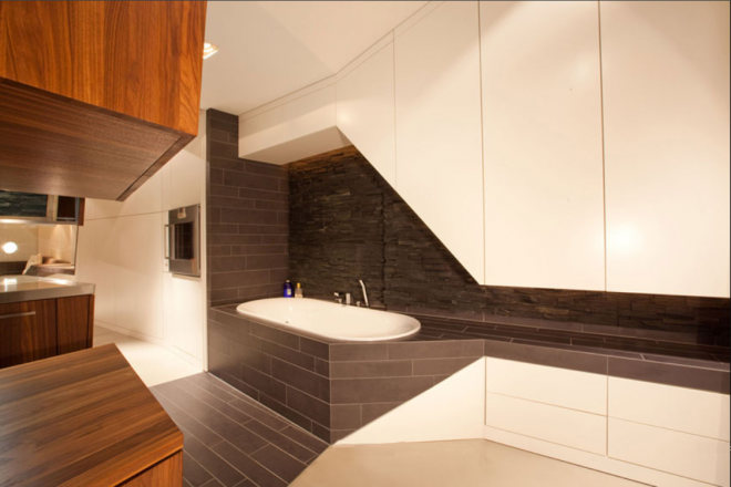 A small bathroom toilet space is also carved into the core kitchen box, accessed from the opposite site of the main cooking and food preparation spaces and hidden nicely in a cove that is almost invisible when closed (its door being made of the same sheets of plywood veneer that cover the rest of the zone). Across the way, and not for the shy, sits a bathtub which is surrounded by stone which also connects back into the flooring of the kitchen area – a strange but interesting design choice.