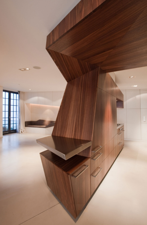 Clad in high-grade wood veneer – in turn cut by thin and criss-crossing lines of black – the kitchen encourages movement through and around it, each perspective different from the last. Shelves and counters are also sliced out of the main volume, making it seem almost as if the space was hewn from a solid block of wood.