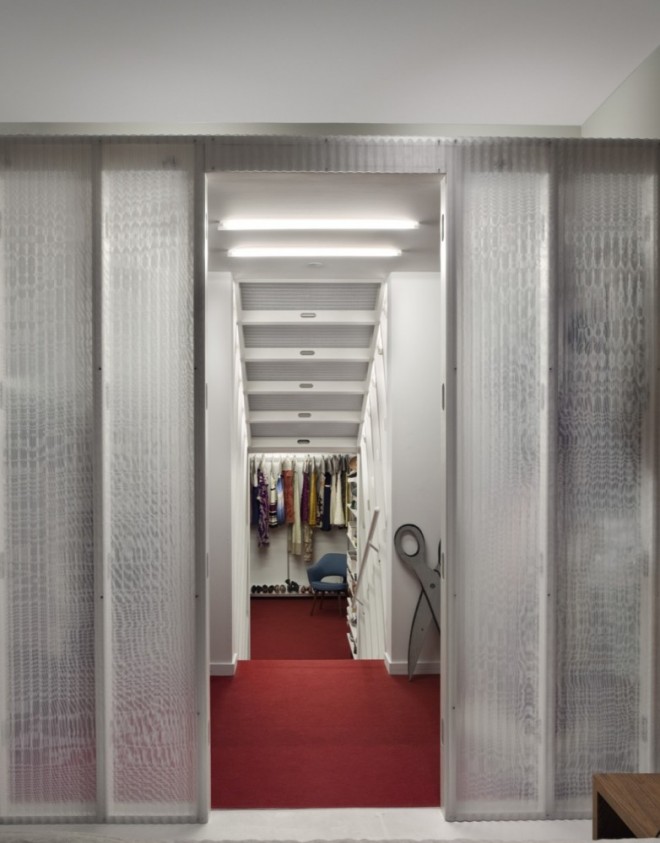 All of the ground-floor stripes are connected by a series of unique tables. The Dining Room table can be extended with a leaf, the Shaker Box tables can be raised or lowered, the Living Room table doubles as a chandelier and can be lowered from the ceiling. All of the tables can be joined together for huge dinners, or twice a year to form a catwalk that can connect to the stairway in the void for the fashion designer’s new collections.