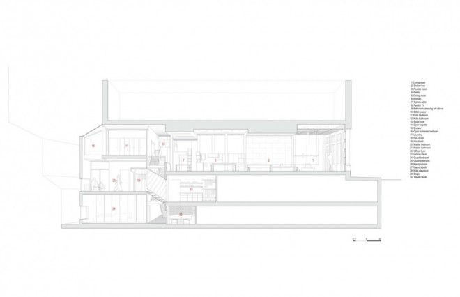 The Void is an indoor light shaft with a mesquite-tiled floor that accommodates the circulation as well as a “Stitchevator†(named after the family dog) carrying tired dogs, snacks or toys between levels and a translucent bridge connecting the Master to a megacloset behind; the Bedrooms zone contains two kids rooms at the top, Master at the basement level and Nanny and Guestroom at the bottom; the Skylight strip employs a number devices (glass, voids, an outdoor courtyard) to distribute light among all of the levels; the rear Garden is a small stripe of green – and chicken coop.