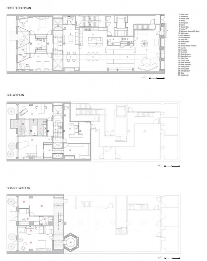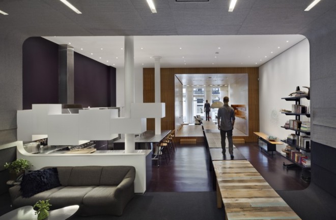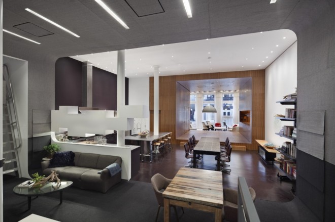 Architects WORKac has recently completed this fantastic interior: a 6,000 SF loft apartment that encompasses a full ground floor, half a basement and one third of a sub-basement: an “inverse triplex†for a family of four that loves to entertain.