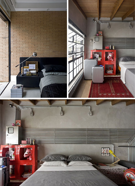 The single most compelling (and unifying) design element is a less-than-likely choice by Guilherme Torres: a series of cable-carrying tubes that interconnect the interior electrical system. Curving lines converge, diverge and terminate along clearly-planned paths, joining in junction boxes then splitting off and traveling around the home again. Hiding these would have cost far more than what has been done here, where they are exposed and treated as part of the overall aesthetic of each room.
