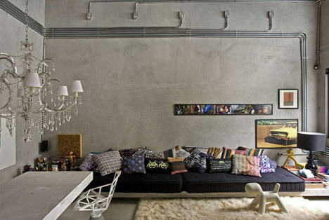 Bare concrete walls and built-ins are balanced by a few detailed antiques, like a hanging chandelier and old wooden wardrobe. Black- and white-painted areas as well as exposed brick offer further material variety, without requiring any serious structural work – most is left as it was, while painting a new layer is relatively easy.