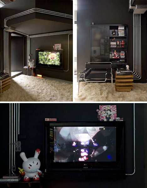 There are a number of lessons to be taken from this architectural-and-artistic experiment, but perhaps most of all: when shopping at the hardware store, consider the palette of materials before you – particularly the items you plan by default to stow secretly in the wall (often at great expense). Could these take the place of other interior design objects?