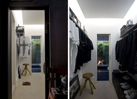 Recessed lighting set against a white exterior, entered from a contrasting black room, makes the closet appear refined and elegant, but a drop-down panel is not difficult nor expensive to suspend.