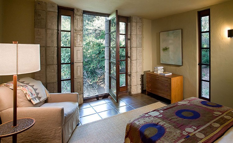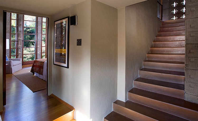The home has four bedrooms and four bathrooms, two kitchens, and a studio guest house that was designed by Frank Lloyd Wright’s son, Lloyd Wright, a year after the original home was completed.