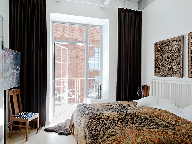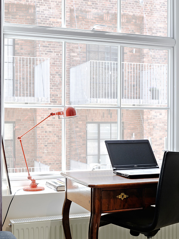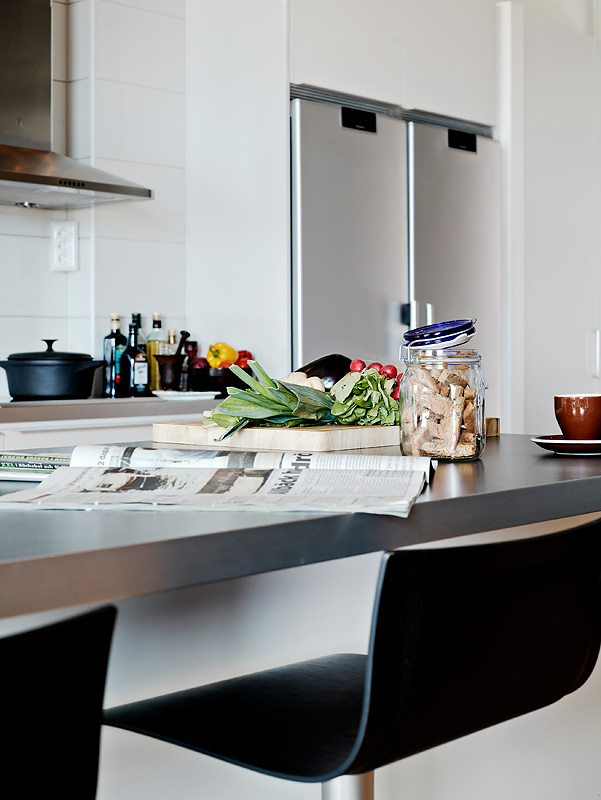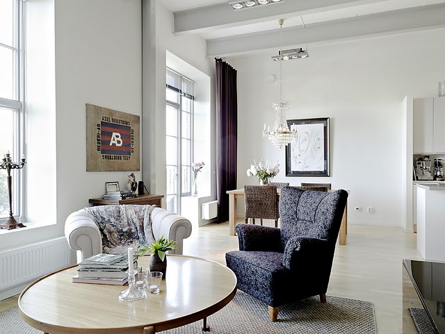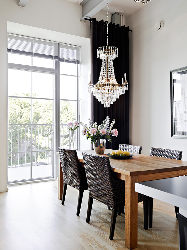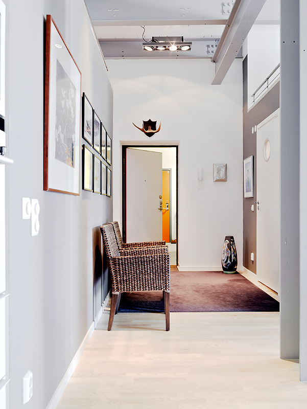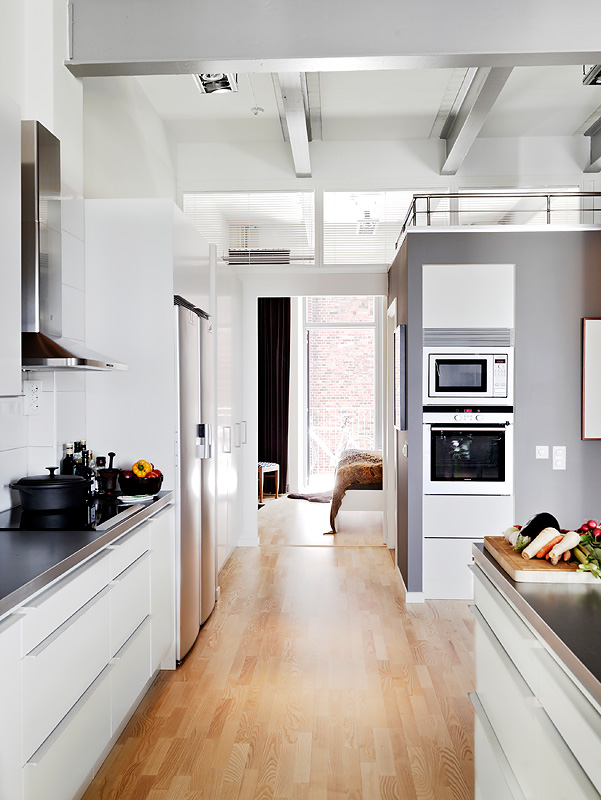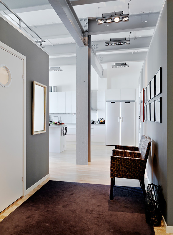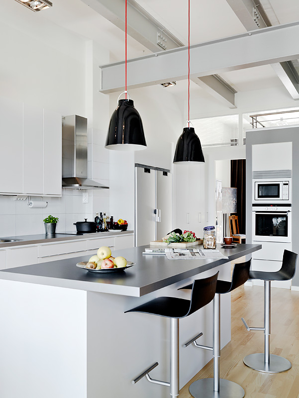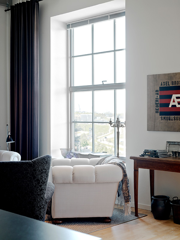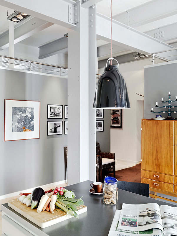 This loft is located in an old jewel mill in a reclaimed former industrial area, near the harbor of Eriksberg, Sweden. The architecture has been allowed to continue characterize the residential environment, which continues in the interior.
