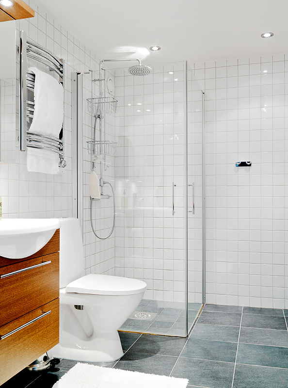 The bathroom is in a stylish and timeless design with white tiled walls and gray, slate-like tiled floors. The glass-enclosed shower corner is equipped with both overhead shower and hand nozzle.Â