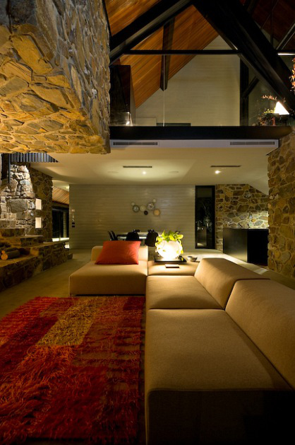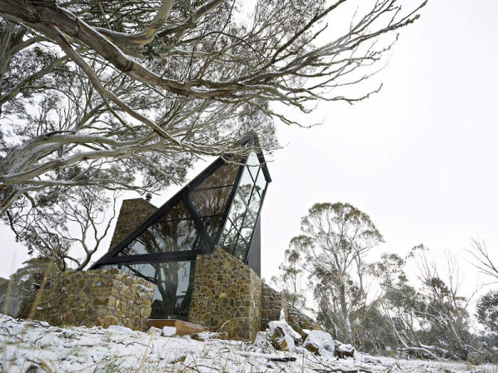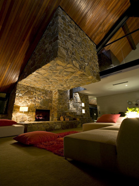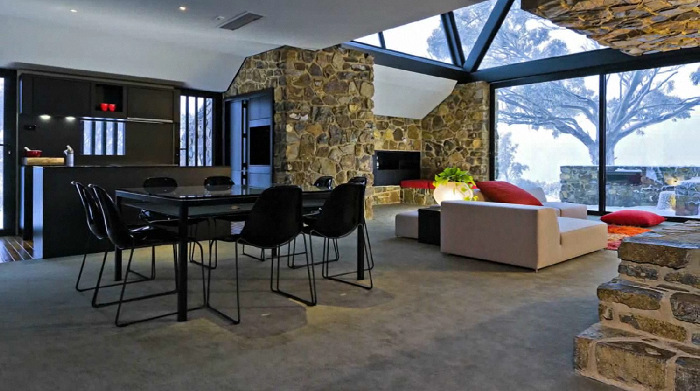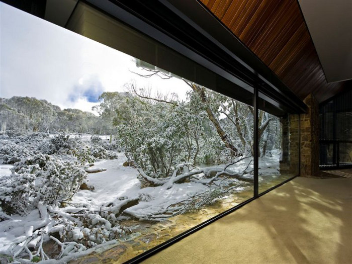 Perched on the edge of an alpine reserve in Dinner Plain Village, part of the highest approved freehold land in Australia, the home is located just 10 minutes from down hill skiing at Mount Hotham. Featuring extensive 8 x 9 sq metre glass panels, sweeping alpine views are drawn in to the interior of the home, which also features a 20 tonne cantilevered fire place made of local stone.