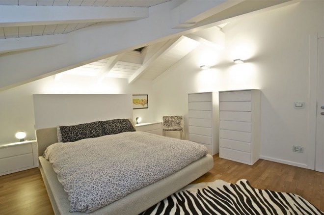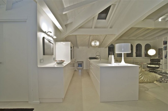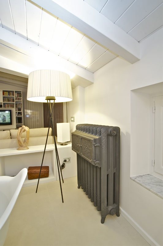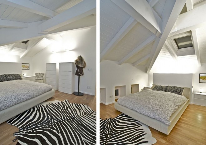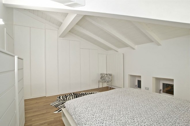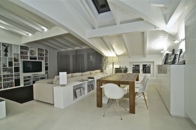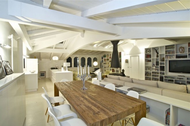This penthouse is on the top floor of a historic building, an old barn with a new wooden roof. A perfect rectangle, characterized by small openings in the floor and 5 arched windows overlooking the square.