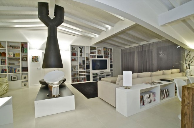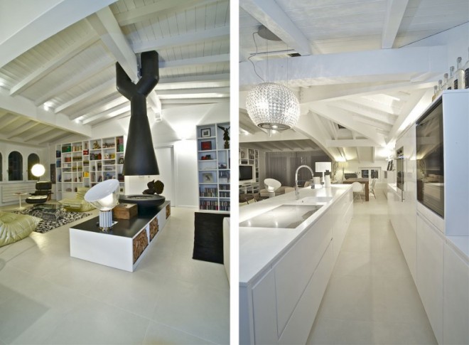 The plan is divided into symmetrical zones with furniture along the walls. Everything revolves around a bare metal fireplace suspended in the center built especially for this home. Another focal point is the kitchen – a big, shiny white island and the dining area with wood table.