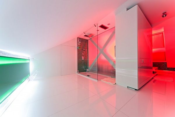 But wait that’s not all, the last floor is only for the master bedroom and a funcky bathroom that is high style and has a lot of colored light fixtures for every taste.
