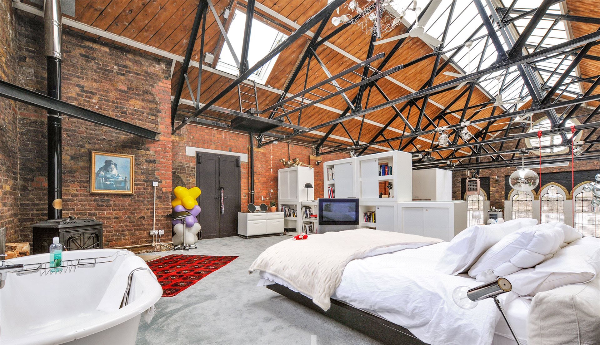 The loft has retained many of its original features with high ceilings, pitched roof and huge windows and 2 sleeping decks. Ideal for the creative types looking for a live/work base in the heart of Shoreditch.