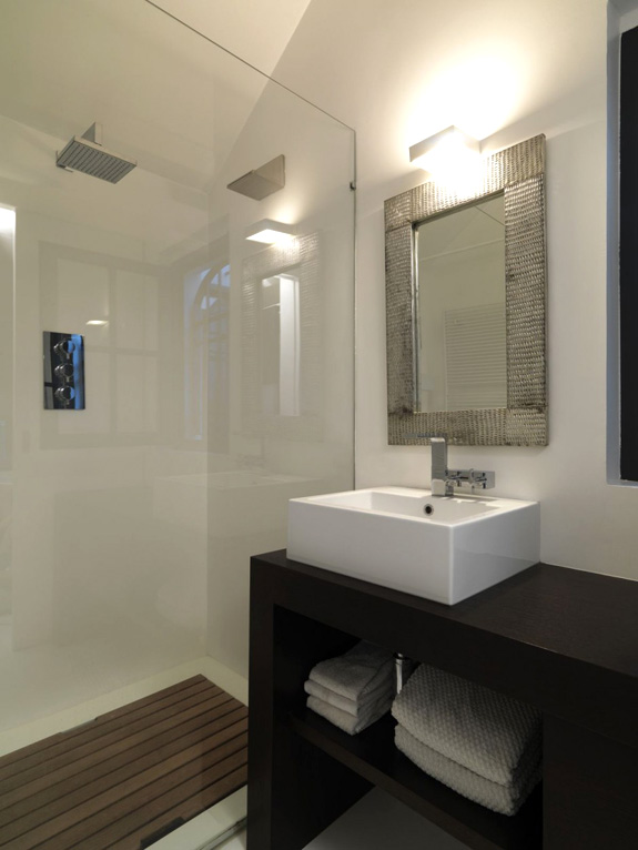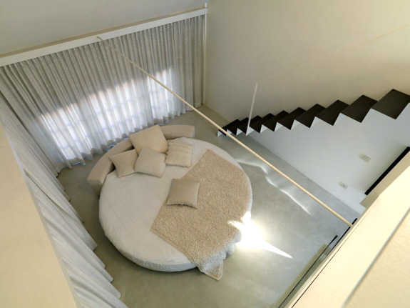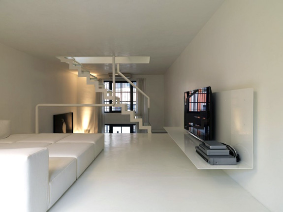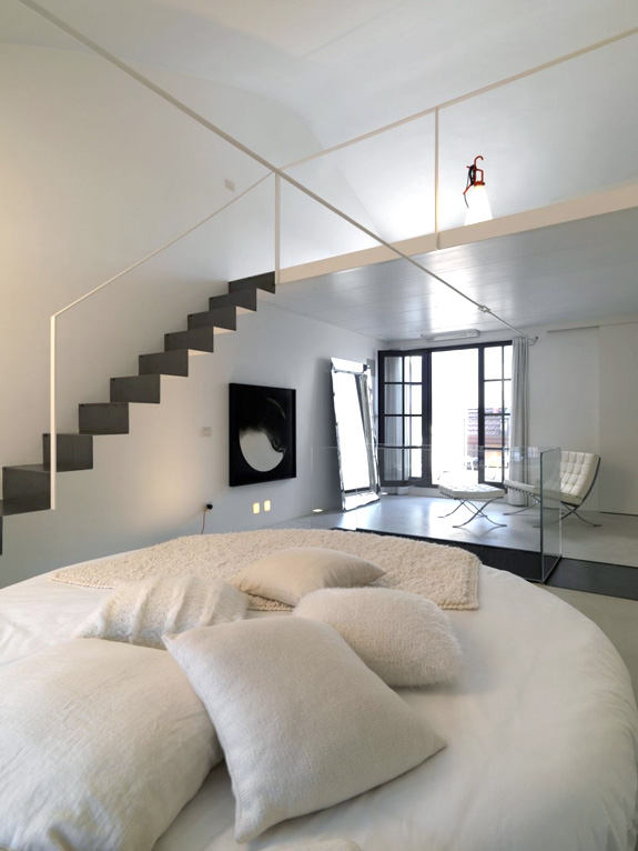 In the first loft, the staircase is the dominating presence- deep black with hollow risers which almost creates an optical illusion from the ground floor. Alternatively, the other half of these Twin Lofts flaunts an elegant yet understated companion to the staircase in the first apartment, this one with crystal treads for a light and dematerialized look.