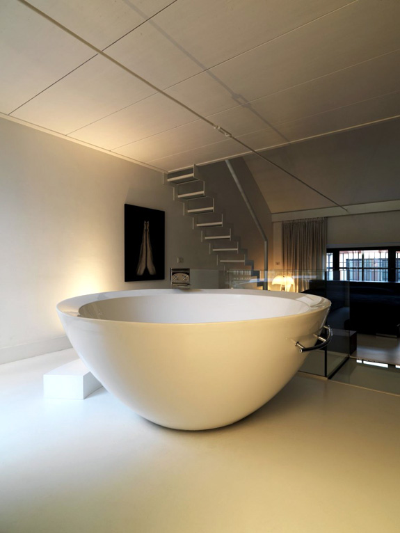 Everything from artwork to interior design ideas mimic and mirror each other from each side of the split home- including a set of paintings by Giovanni Manfredini that nearly act as negatives of one another. Each washroom, featuring a mega-sized round bathtub, creates a relaxing and welcoming environment: one being light and open, while the other is dark and almost mysterious with just one surprising sky light shining down from high above.